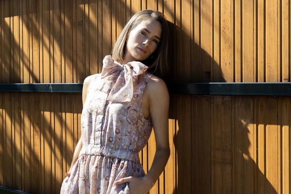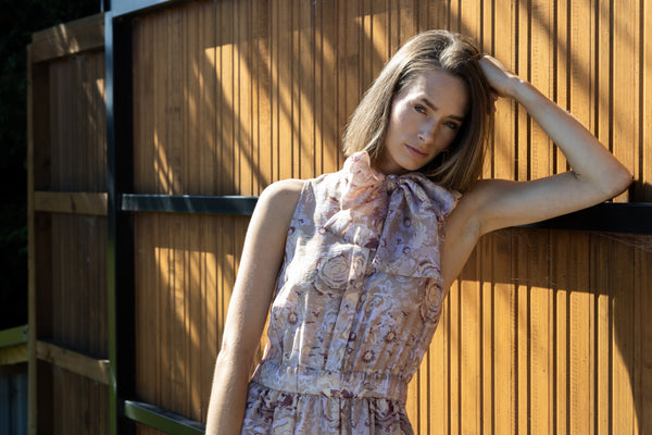 The exquisite Melrose Dress in Gold Rose - the epitome of elegance for any special occasion. This stunning dress boasts beautiful gold tones, complemented by a hint of merlot. Its halter-style neckline features a versatile bow that can be worn in various ways - as a bow, loosely draped, or wrapped around the neckline. The dress is adorned with a covered button placket, while the elastic waist ensures a comfortable fit. The full tiered skirt adds a touch of sophistication, and to top it off, this dress even comes with pockets. Experience the perfect blend of style and functionality with the Melrose Dress in Gold Rose.