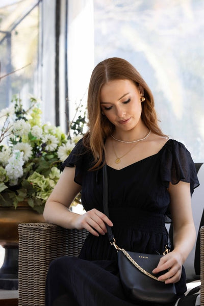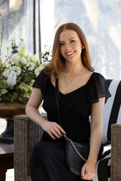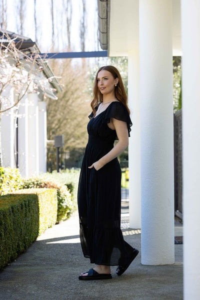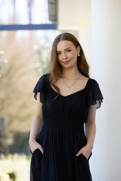 Miah Dress from Drama the Label – the perfect choice for any occasion. This exquisite dress features a flattering V-neckline, a wide elastic waistband for comfort, and elegant flutter sleeves that add a touch of sophistication. The midi length offers versatility, while the convenient pockets provide practicality. A shirred panel at the back ensures ease of movement, making it as comfortable as it is stylish. Available in stunning black the Miah Dress is a must-have addition to your wardrobe.