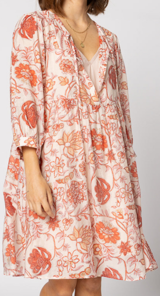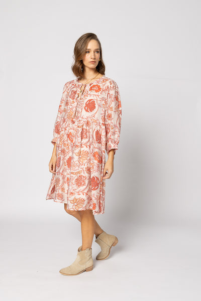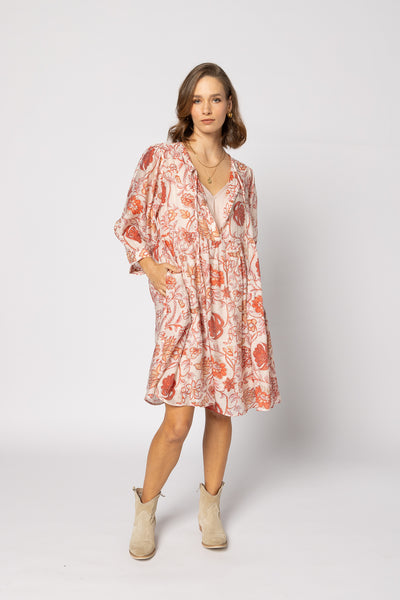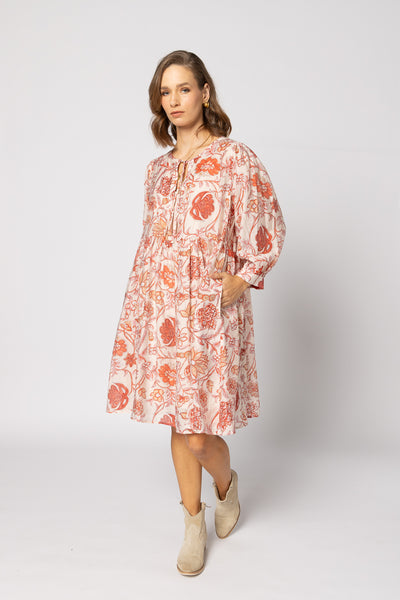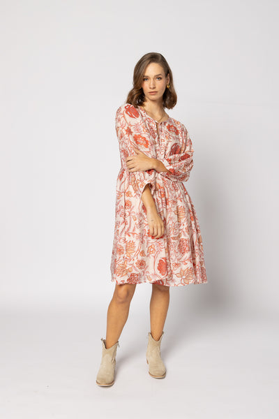 The Indi Dress from Drama the Label is easy to wear, made from a lovely Soft Viscose/Nylon Mix in a Ruby Flower Print that showcases tones of Red and Pink. It features a bib-style placket with a self-tie, long sleeves with elastic cuffs, and practical pockets.