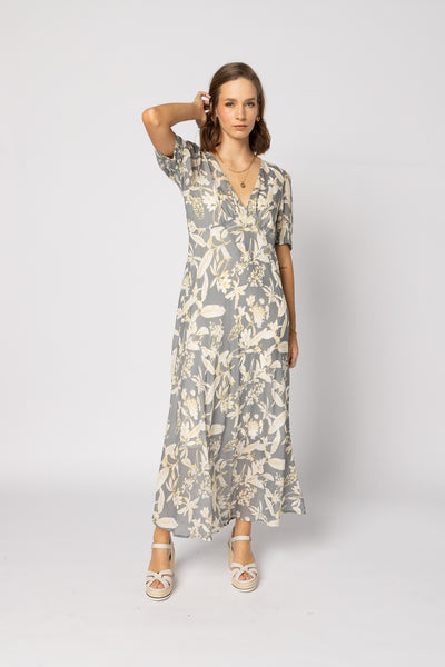 Reflect Dress in a captivating Dusk Floral print. This dress boasts a V-neckline and a flattering bias cut, ensuring a perfect fit for any body shape. Designed with convenience in mind, it features a side zip for easy access. The dress falls elegantly to a midi length, excluding sophistication and style. To add a touch of uniqueness, the sleeves are adorned with half elastic cuffs. Elevate your wardrobe with this professionally crafted, eye-catching dress that effortlessly combines fashion and functionality.