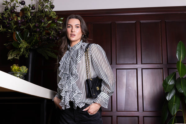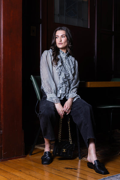 This beautiful long sleeve blouse from Loughlin features a double frill that flows down the front. It has frill details on the cuffs and neckline, adding a stylish touch.