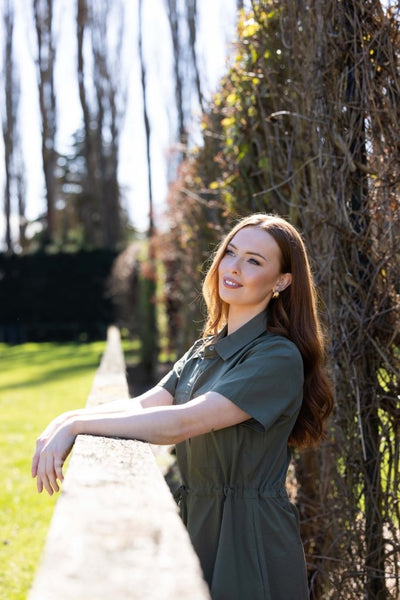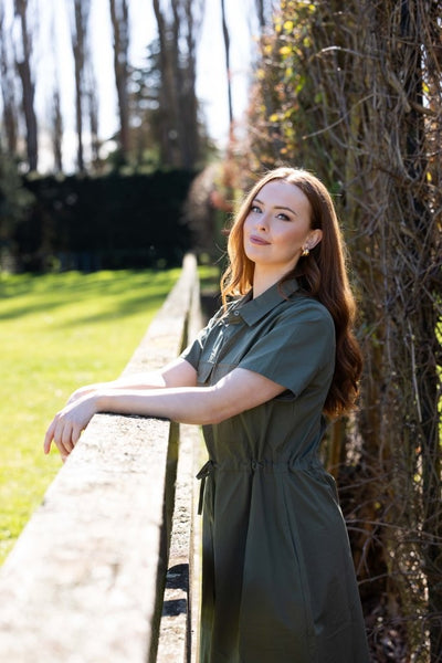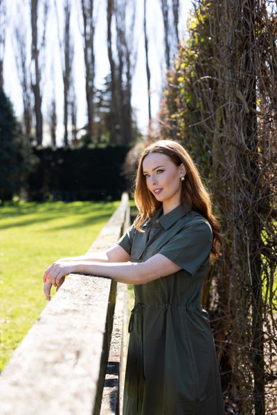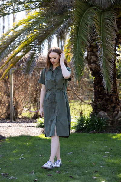 Introducing the Biddy Dress, a versatile military-style shirt dress designed for effortless wear. This chic garment features knee-length side splits for added mobility, a customizable drawcord waistline that allows you to adjust the fit to your preference, and both side and front pockets for practicality. Elevate your wardrobe with this stylish and functional piece.