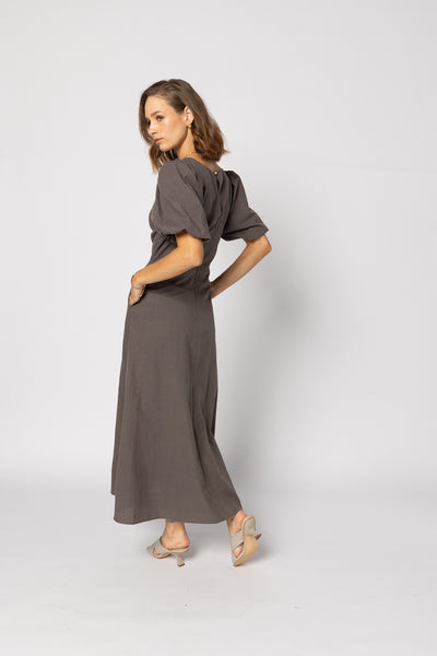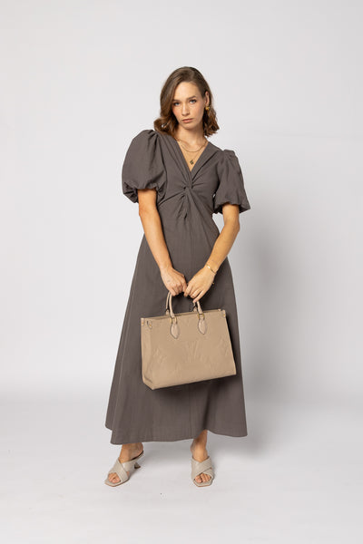 The Halo Dress is back by popular demand, the versatile and elegant dress is an elegant choice for any event.  The dress is adorned with a charming knot detail at the front, stylish puff sleeves, side "pockets", a convenient zip closure at the back, and gracefully fall to a midi length and is fully lined.
