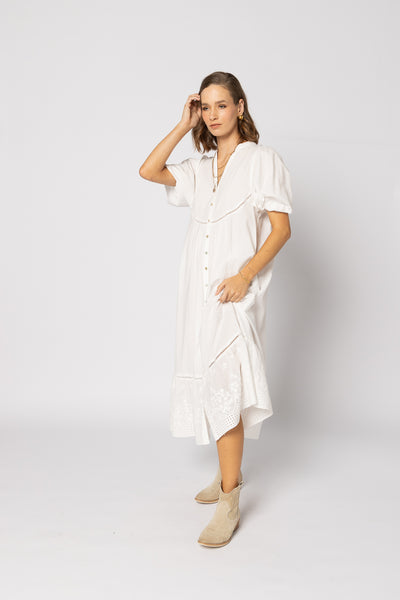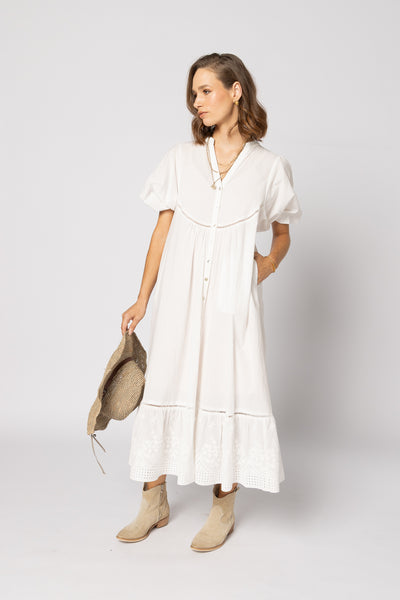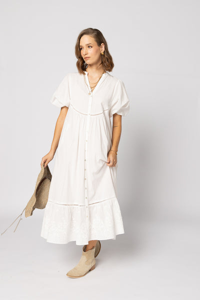 The Josephine Dress from Drama the Label is effortlessly wearable and serves as the ideal choice for any event. It showcases a button front, ladder lace detailing, a midi length, puff sleeves, convenient pockets, and an embroidered trim at the hemline.