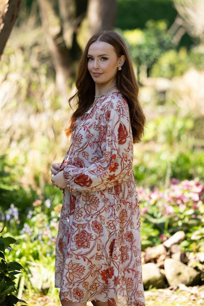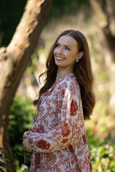 The Indi Dress from Drama the Label is easy to wear, made from a lovely Soft Viscose/Nylon Mix in a Ruby Flower Print that showcases tones of Red and Pink. It features a bib-style placket with a self-tie, long sleeves with elastic cuffs, and practical pockets.