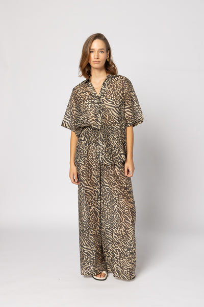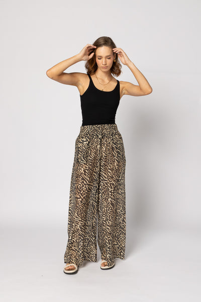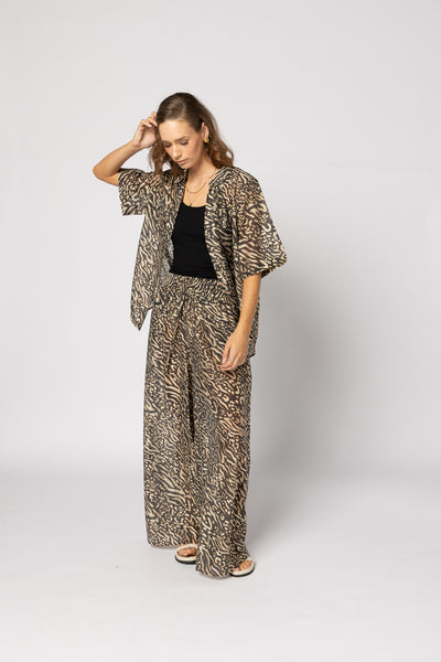 4062 - Pilazzo Pant - Zebra Print Pilazzo pants offer both comfort and style, featuring an elastic waist, wide leg, and floaty design. Made from a beautiful cotton fabric in Zebra Print, they also come with convenient side pockets. Pair them with Piza Shirt for a fun set or any of Drama the Label's new season tops for a chic and versatile look." Composition: 100% Cotton