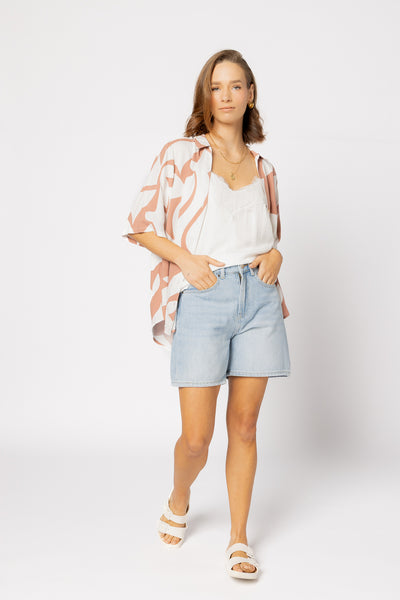 The Piza Shirt features a button front, short sleeve oversized design made from 100% viscose, showcasing a stylish Geo Print print. Pair it with the Bondi Shorts for a chic and enjoyable ensemble.
