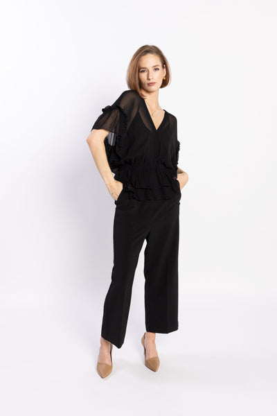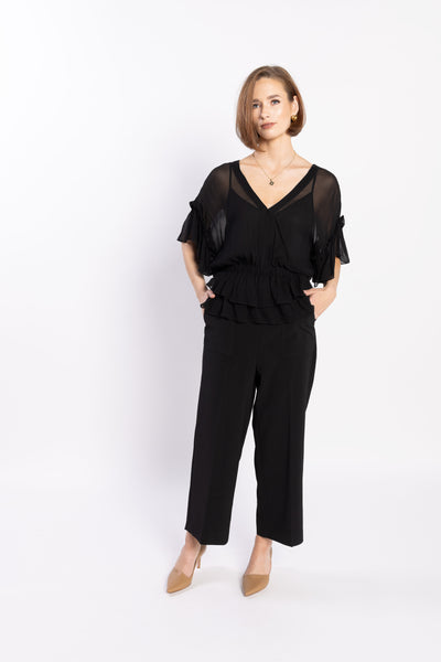 This meticulously crafted blouse boasts intricate detailing that is sure to captivate. Its elegant V-neck design is complemented by an elastic waistband featuring a double hem frill, adding a touch of sophistication. The drop shoulder sleeves with frill detail further enhance the blouse's charm. Notably, this blouse comes with an attached cami, ensuring both comfort and convenience. Elevate your wardrobe with the Brooke Blouse, a true embodiment of timeless elegance.